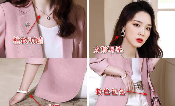 就像这套粉色小西装,搭配白T恤和白裤子,减龄效果真的很棒。在选择配件的时候没有必要过度。简单的项链和手链最后一个粉色的包包很漂亮。