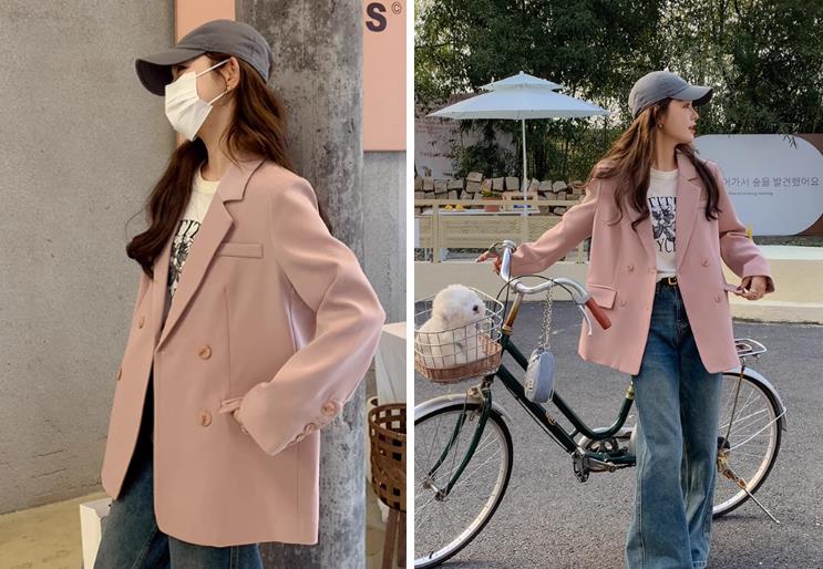 粉色西装+白T恤+牛仔裤。不同深浅的粉色也会产生不同的效果。浅粉色更清新、更精致,而深粉色则更饱满、更有活力。就像这套浅粉色的西装,也给人一种沉稳宜人的感觉,适合在柔和的场合或者温馨的气氛下穿着。