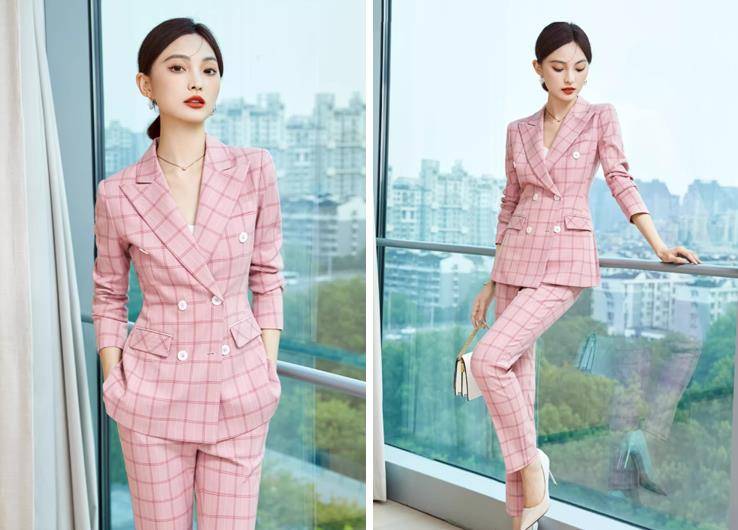 粉色西装+白衬衫+白裤子。粉色通常给人一种柔和、温暖、甜美的感觉,因为粉色是浅色,常常与女性化、童话般的氛围联系在一起。穿粉色的衣服可以衬托出你女人味的一面,给整体造型增添一点温暖和亲和力。