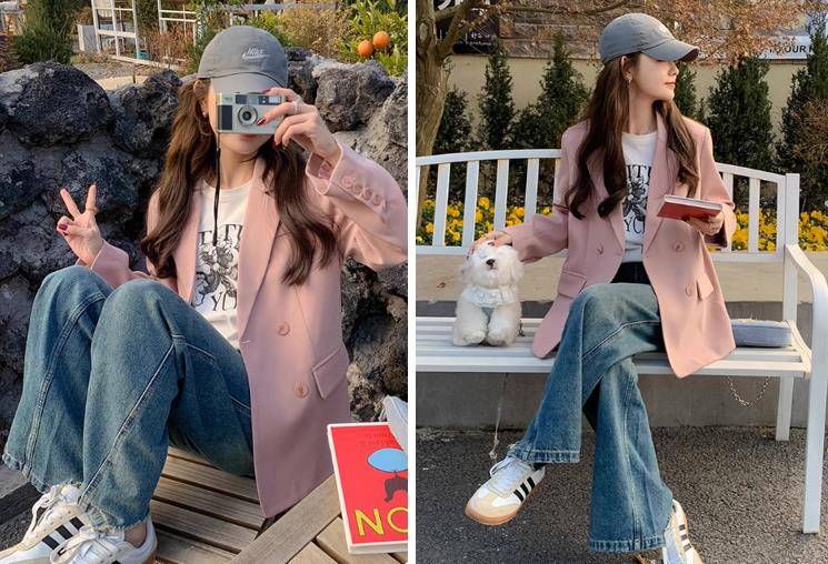粉色西装+白T恤+牛仔裤。不同深浅的粉色也会产生不同的效果。浅粉色更清新、更精致,而深粉色则更饱满、更有活力。就像这套浅粉色的西装,也给人一种沉稳宜人的感觉,适合在柔和的场合或者温馨的气氛下穿着。