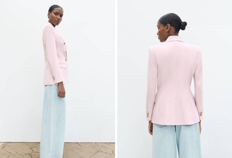 就像这套粉色小西装,搭配白T恤和白裤子,减龄效果真的很棒。在选择配件的时候没有必要过度。简单的项链和手链最后一个粉色的包包很漂亮。